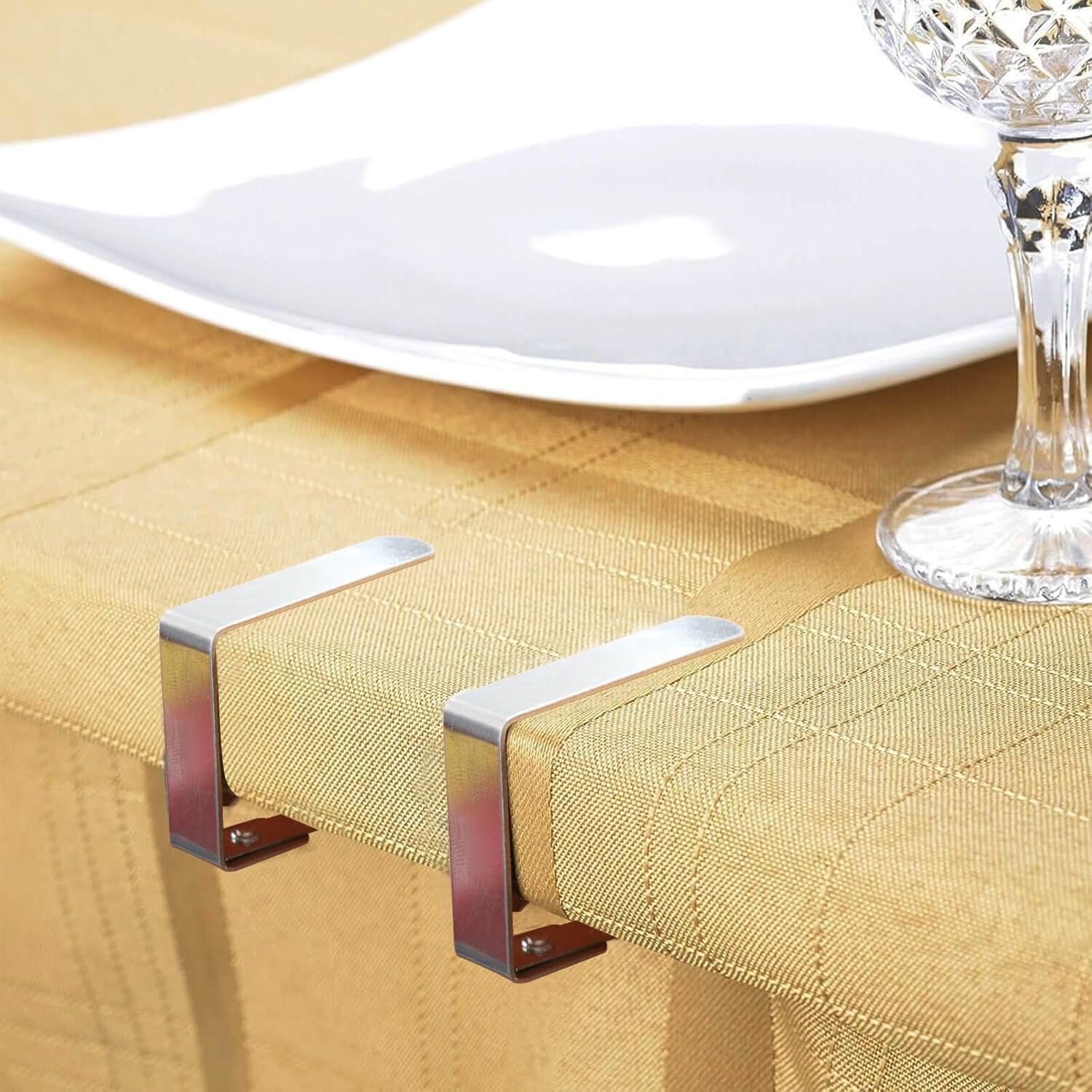 - The tablecloth clips are easy to install and take off. Slide them on and these clips will self adjust to hold tablecloths tightly in place.